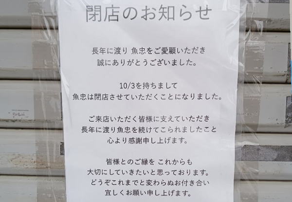 【幕張町1丁目 魚忠さん閉店のお知らせに(/_;)(/_;)(/_;)なみだ】