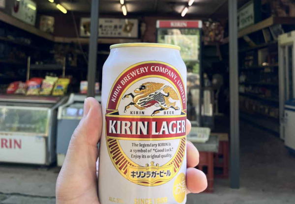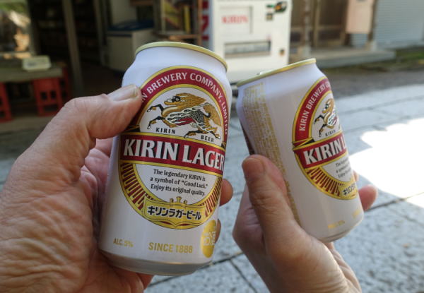 老舗の酒屋さん「須永商店」さんの前のベンチで、キリンラガー。
