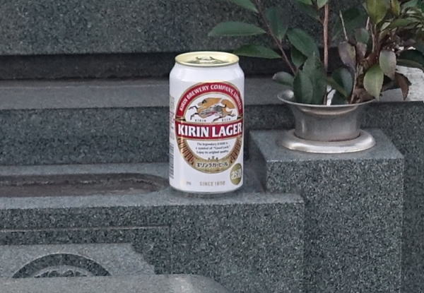 父の墓前にキリンビール。(生前の父が好きだったビール)