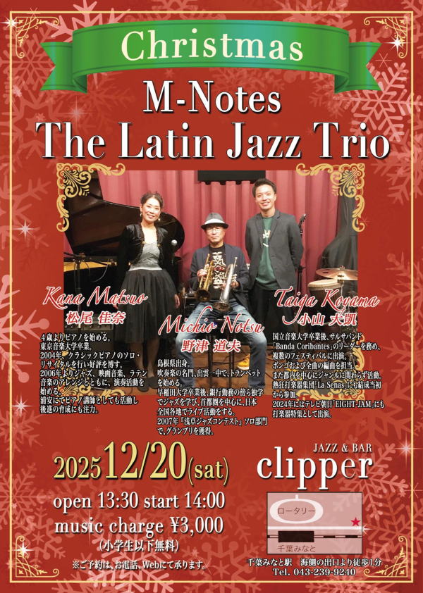 12月20日(土)14時より、千葉みなとクリッパーにて『M-Notes The Latin Jazz Trio』クリスマス・ライブです!!