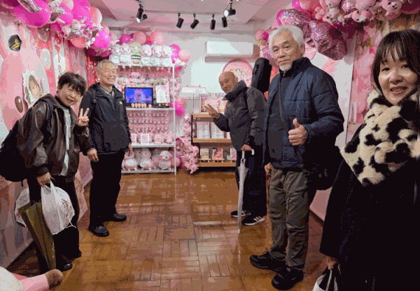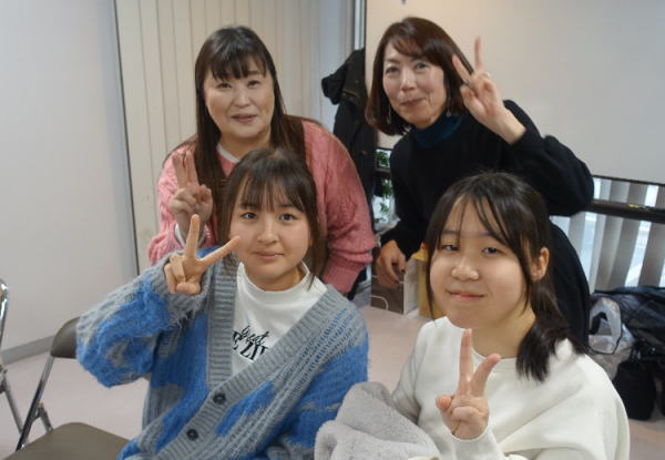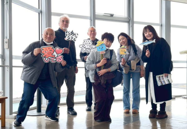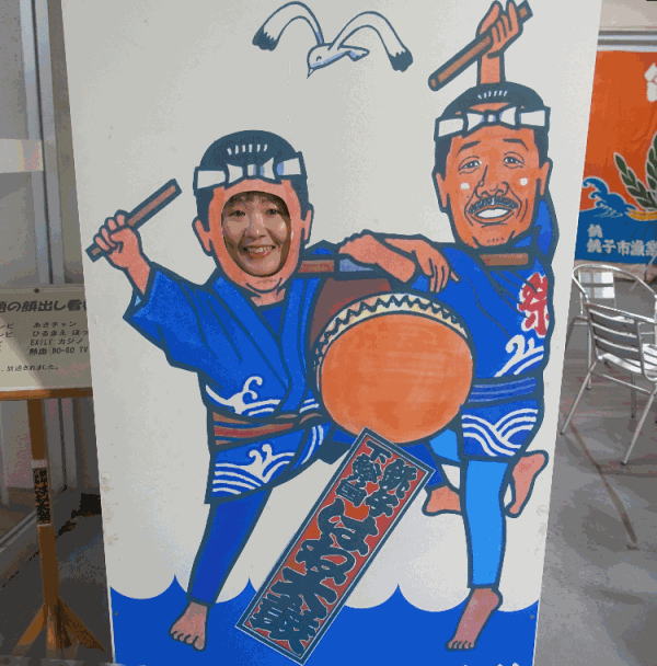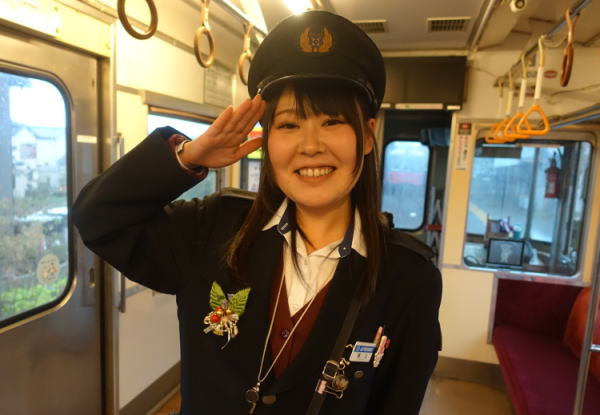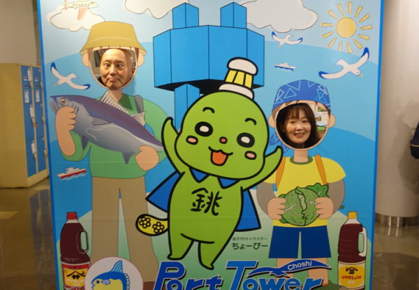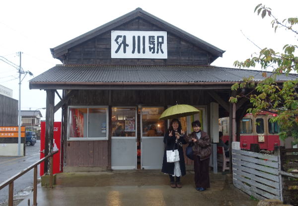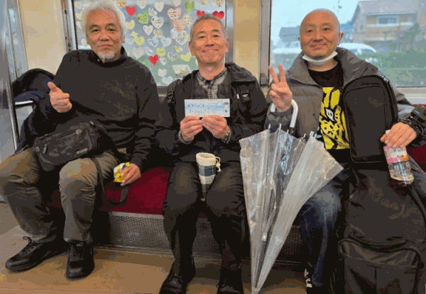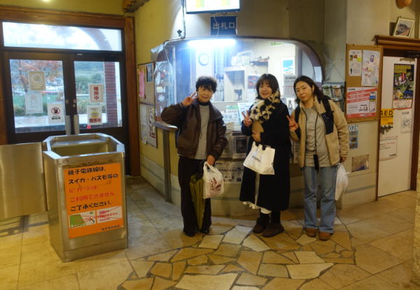 それぞれ手にしている長方形のものは銚電の一日乗車きっぷ。