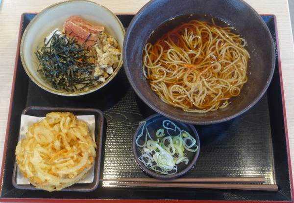 坂ちゃんに教えてもらった、焼き鯖丼と温そばで、税込550円。