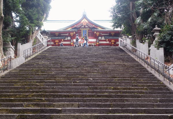 この神社には3方向からこのような広く高度差のある石段があるが、この方向からは初めて。