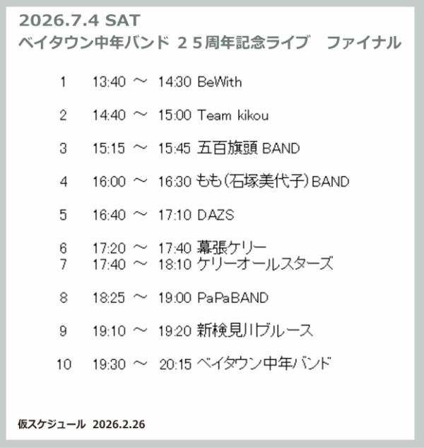 7月4日(土曜)のライブの仮スケジュール。