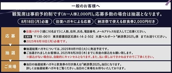 〒130-0011 東京都墨田区石原4-14-2-502大森ベルポート「納涼祭2025」係までお送りください。