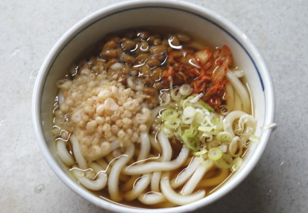 1玉30円くらいのうどんと、納豆、キムチ、揚げ玉、刻みネギという質素さ。