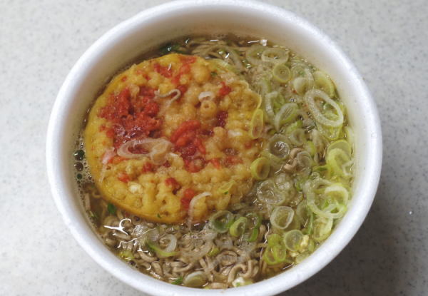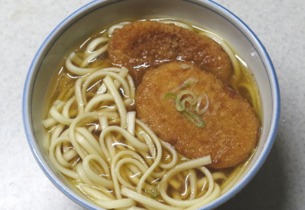 刻みネギが冷蔵庫に入れていたけれど、やや古めになったので、つゆと一緒に火を入れたのだけど、つゆをどんぶりに入れた後にうどんとコロッケを載せたので、底のほうに行ってしまった。
