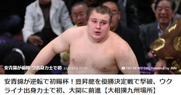 新関脇の安青錦(21、安治川)が優勝決定戦で横綱・豊昇龍(26、立浪)を送り投げで下し、初優勝を果たした。ウクライナ出身力士としては初の賜杯を手にした。成績は12勝3敗。