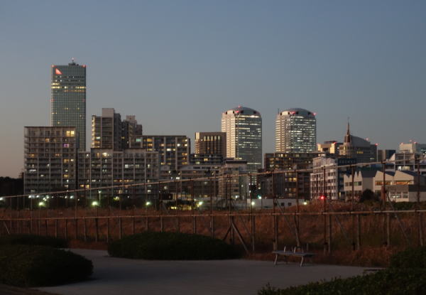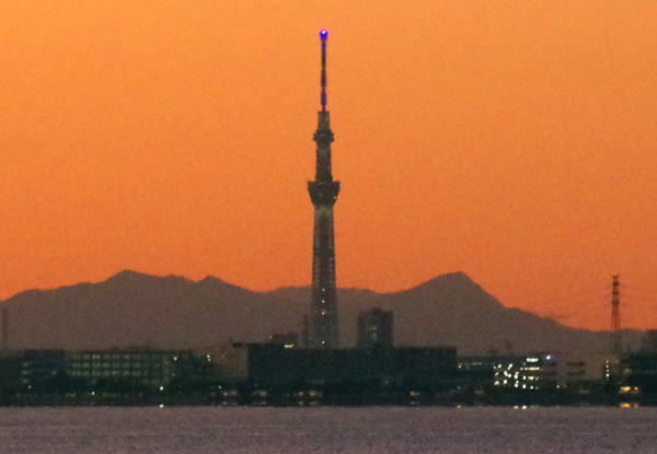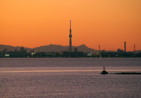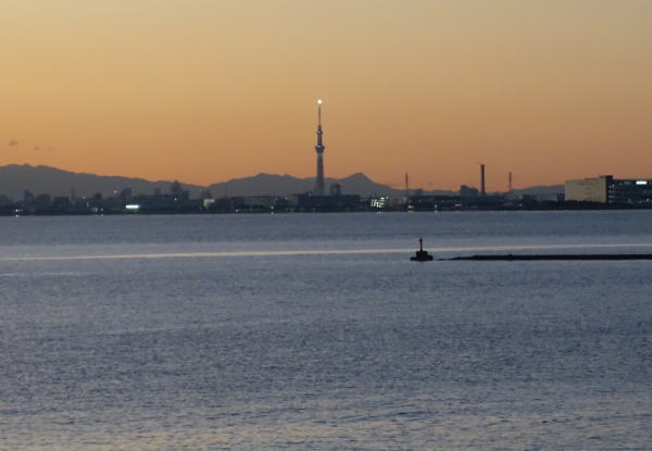 更に少しが経って暮れなずむ幕張の浜からのスカツリ。