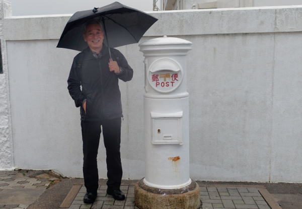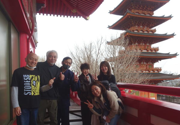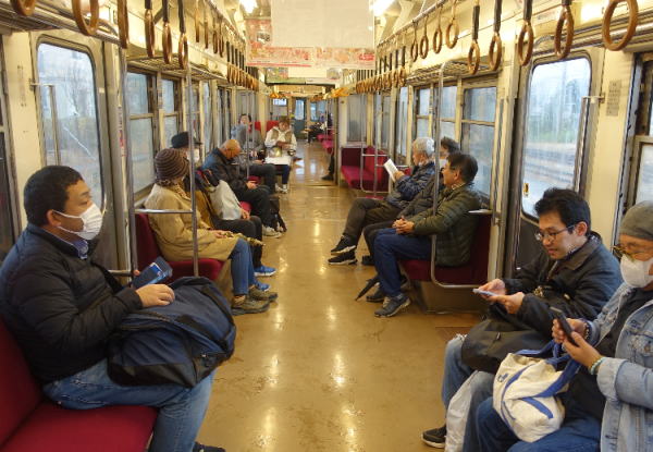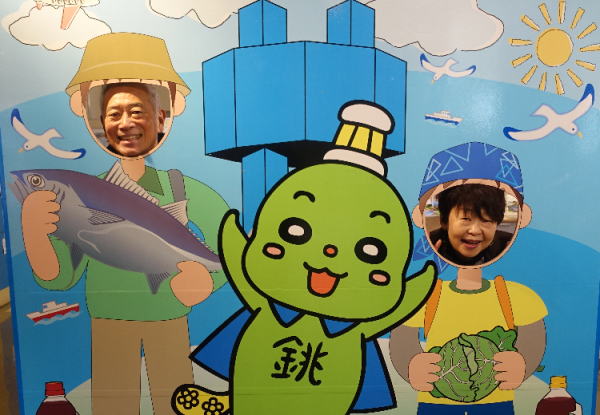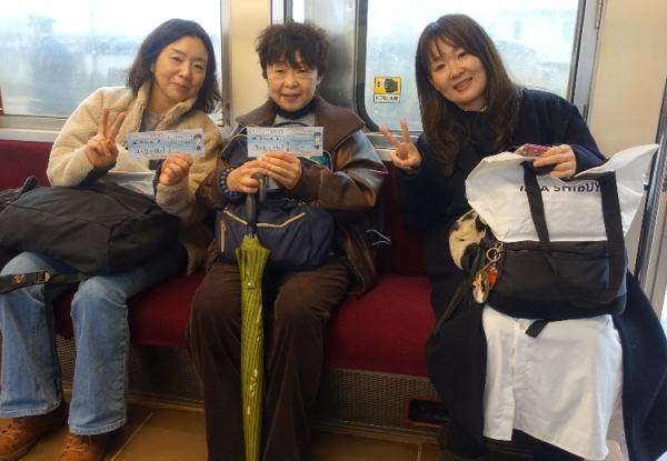 それぞれ手にしている長方形のものは銚電の一日乗車きっぷ。